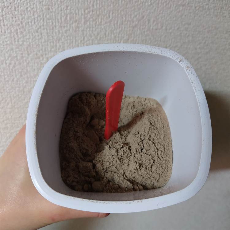 ◆溶けやすさ:動物性プロテインより溶けやすく、粉末はきな粉をより細かくした感じですね。