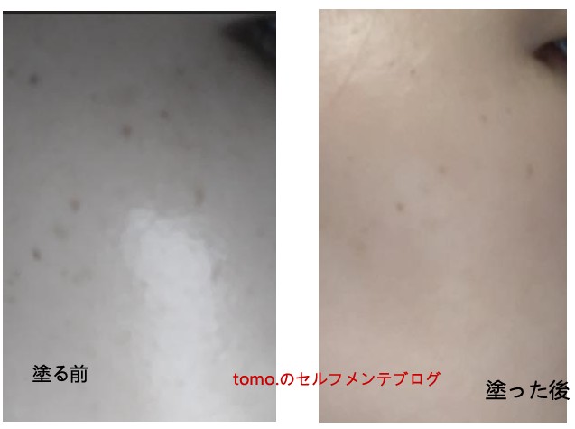 塗る前と塗った後を比べると、薄いシミが目立ちにくくなり、なめらかな見た目になる感じです。ナチュラルな仕上がりですね。